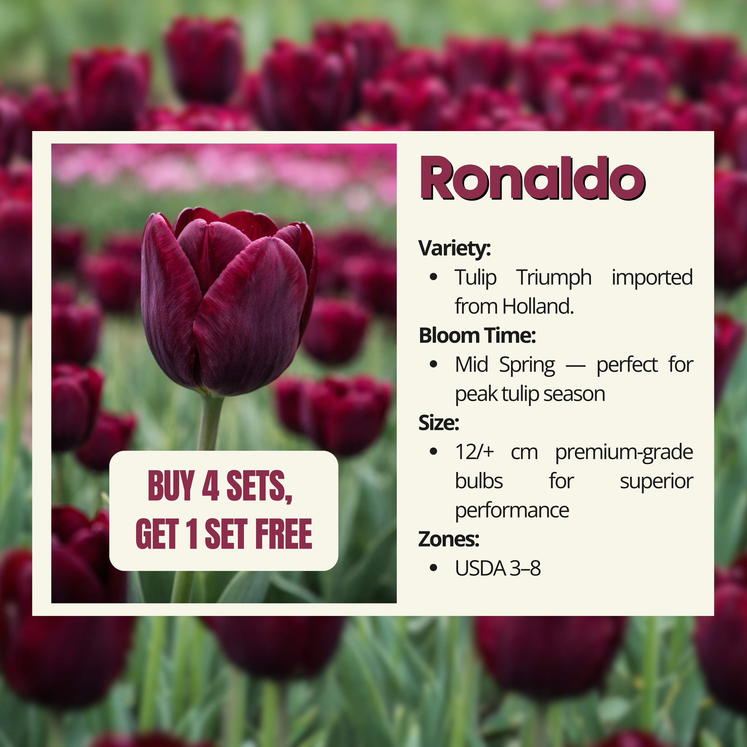 Bring rich, dramatic elegance to your spring garden with Tulip Triumph ‘Ronaldo’ — a standout tulip variety loved for its deep mulberry-burgundy blooms and strong, upright growth. This variety is perfect for gardeners who want bold, moody color that looks luxurious in landscaping, flower beds, borders, and fresh-cut arrangements.