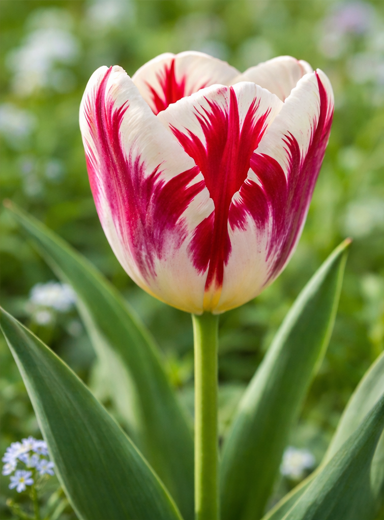 Bring artistry and elegance to your late-spring garden with Tulip Single Late ‘Grand Perfection’, a timeless classic admired for its striking color contrast and sophisticated form. Each bloom unfurls in rich raspberry-red swirls over ivory-white petals, creating a painterly effect that captures the essence of spring refinement.